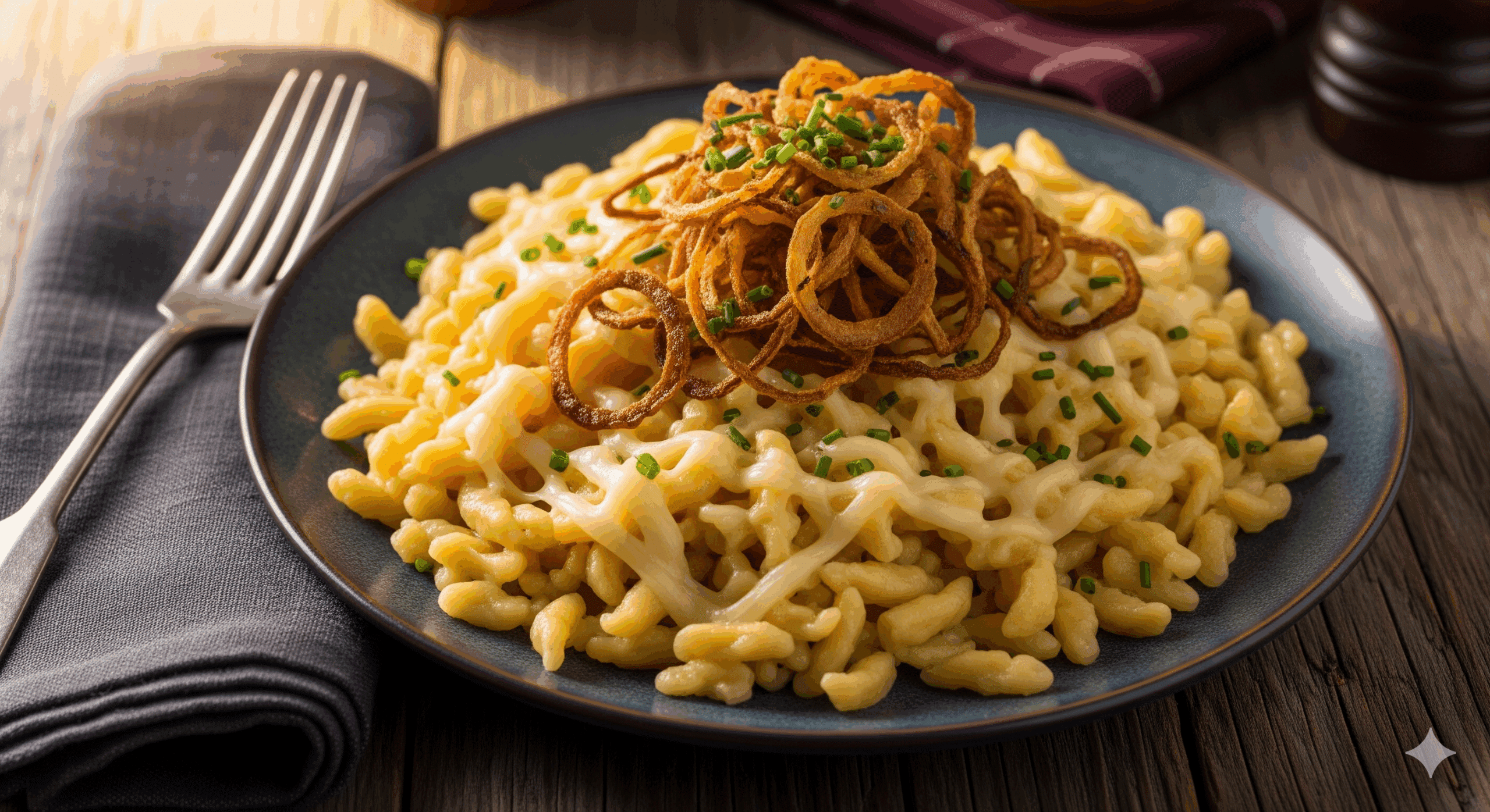 - Der Käse macht den Unterschied: Eine Mischung aus verschiedenen Käsesorten sorgt für ein komplexeres Aroma. Deftiger Bergkäse und Emmentaler geben die nussige, würzige Note, während ein guter alter Gouda für Cremigkeit sorgt. Du kannst aber auch andere Käsesorten wie Allgäuer oder Vorarlberger Bergkäse verwenden.